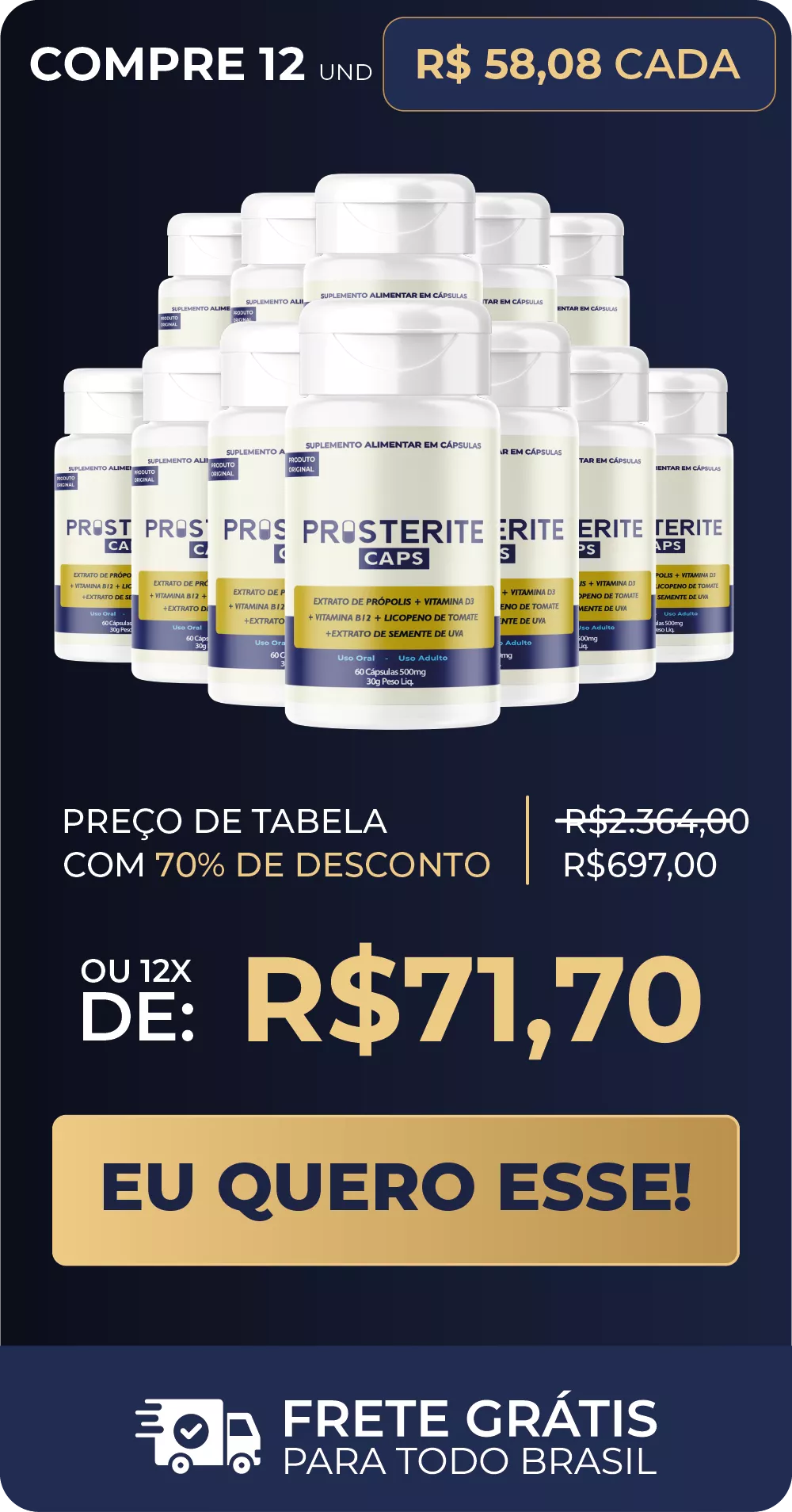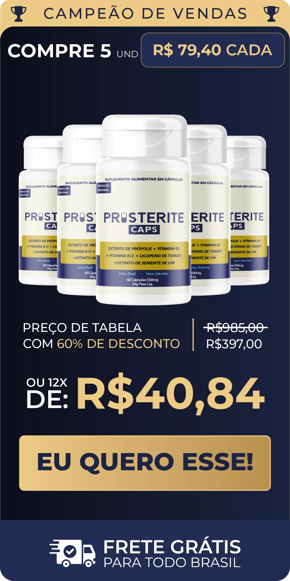 Prosterite Caps combina ativos poderosos para proteger, restaurar e fortalecer sua saúde prostática de forma natural e eficaz. Ação anti-inflamatória e antioxidante poderosa Alívio do desconforto urinário e melhora do fluxo Suporte total para a saúde da próstata Com Extrato de Semente de Uva, Licopeno de Tomate, Cúrcuma, Vitamina D3, Própolis, Astaxantina e Vitamina B1, você cuida da sua saúde sem abrir mão da sua qualidade de vida.